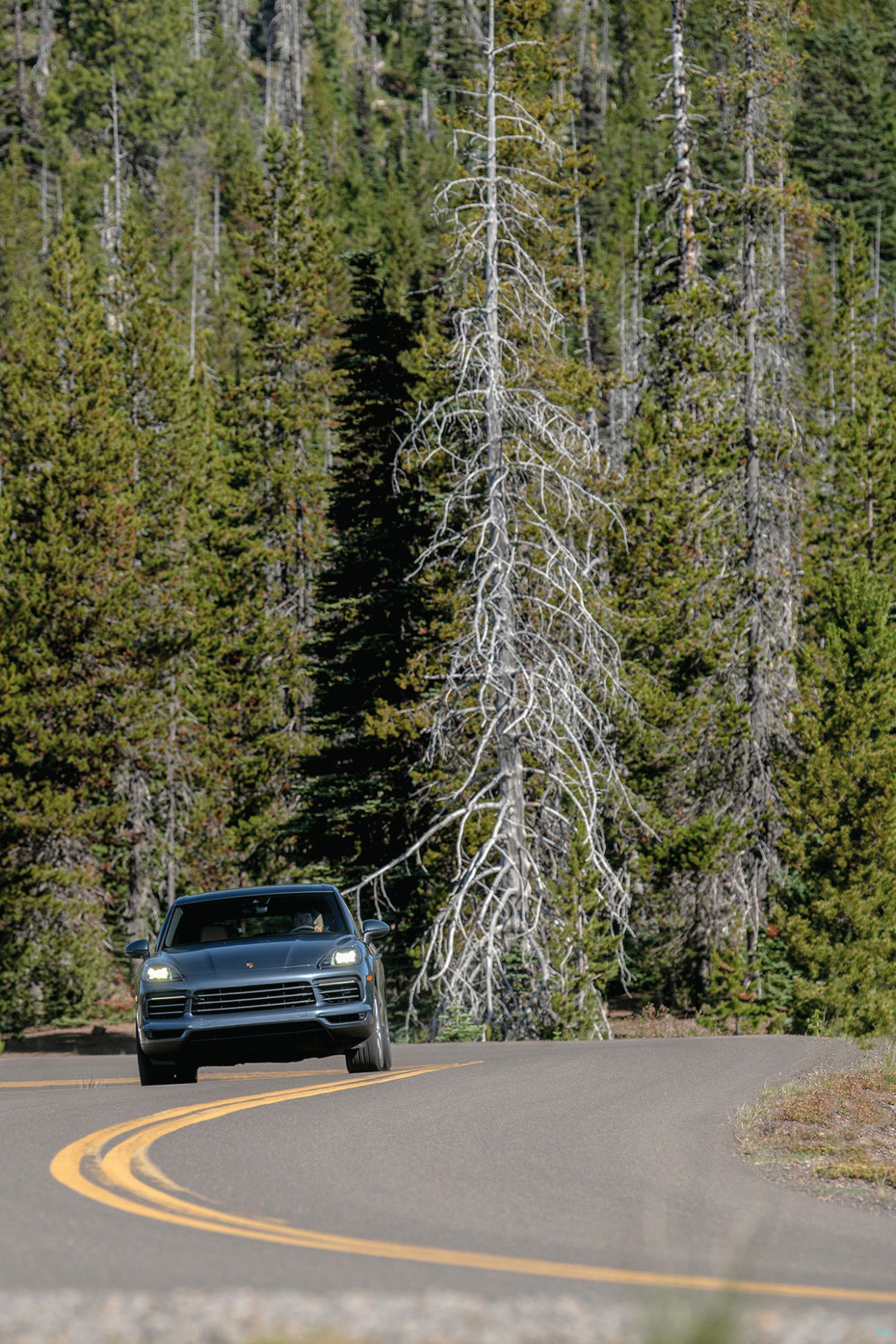 S nulovým časem 60 sekund 4,7 sekundy není divu Cayenne E-Hybrid je rychle mimo bloky a hned vedle. Naše jízdní cesta vedla většinou klikatím po dvouproudých dálnicích buď na úpatí pohoří Cascade Range nebo dolů na Pobřeží Pacifiku. Měli jsme spoustu příležitostí otevřít auto, – velké využití projíždějících jízdních pruhů k předjíždění nákladních vozů a další pomalý provoz (ale doufejme, že neposiluje stereotypy o řidičích Porsche). Zrychlení, zejména ve Sport Plus režim, je vždy k dispozici, když to chcete, a vyladění výfuků zapnuto Cayenne je vynikající do té míry, že jsme stáhli naše okna při procházení tunelem, aby bylo lépe ocenit.