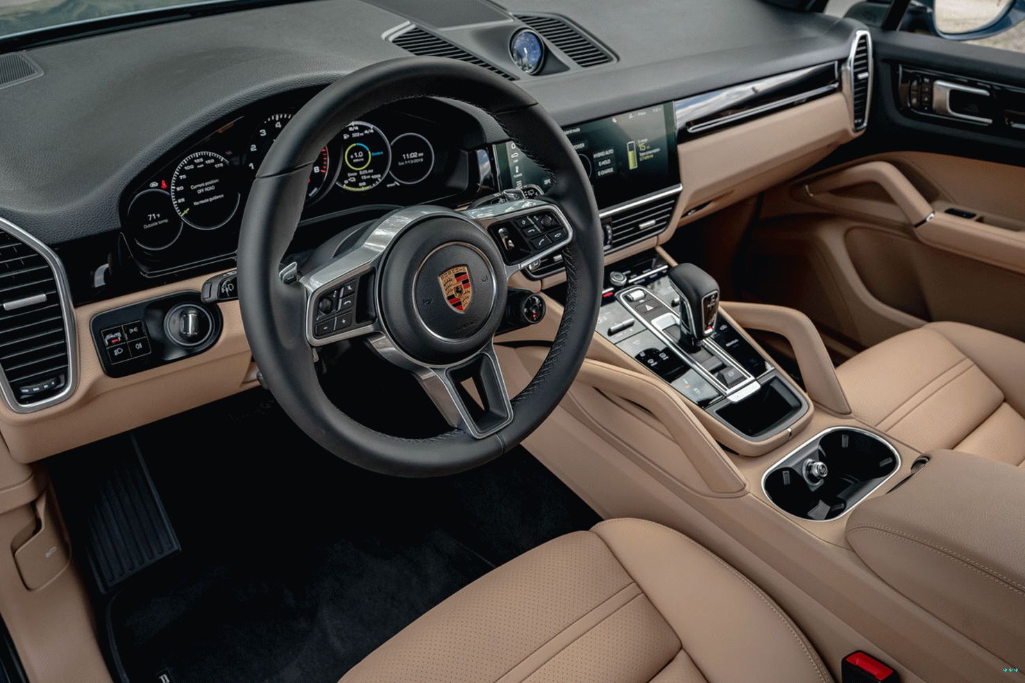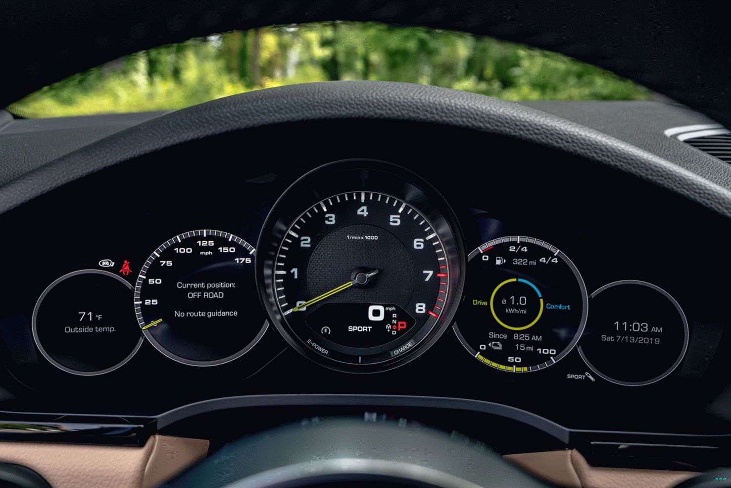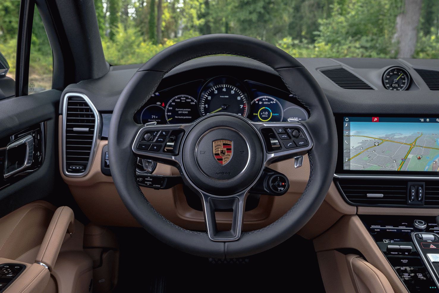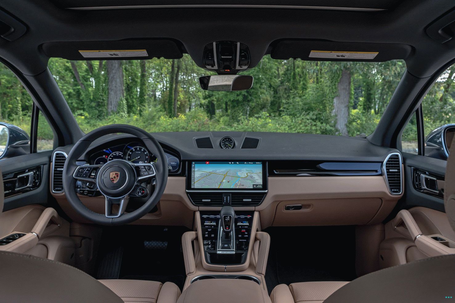 Přístrojová deska Cayenne E-Hybrid si těžce půjčuje od roku 918 Spyder. Střední ciferník je analogový; zbytek panelu sestává přizpůsobitelných digitálních displejů. Heads-up displej je volitelný. Porsche Cars Severní Amerika