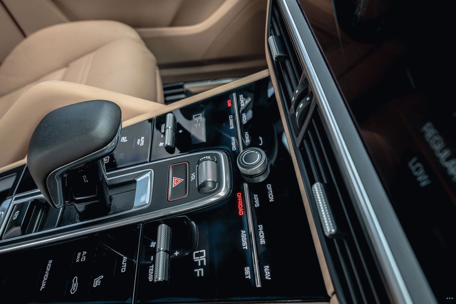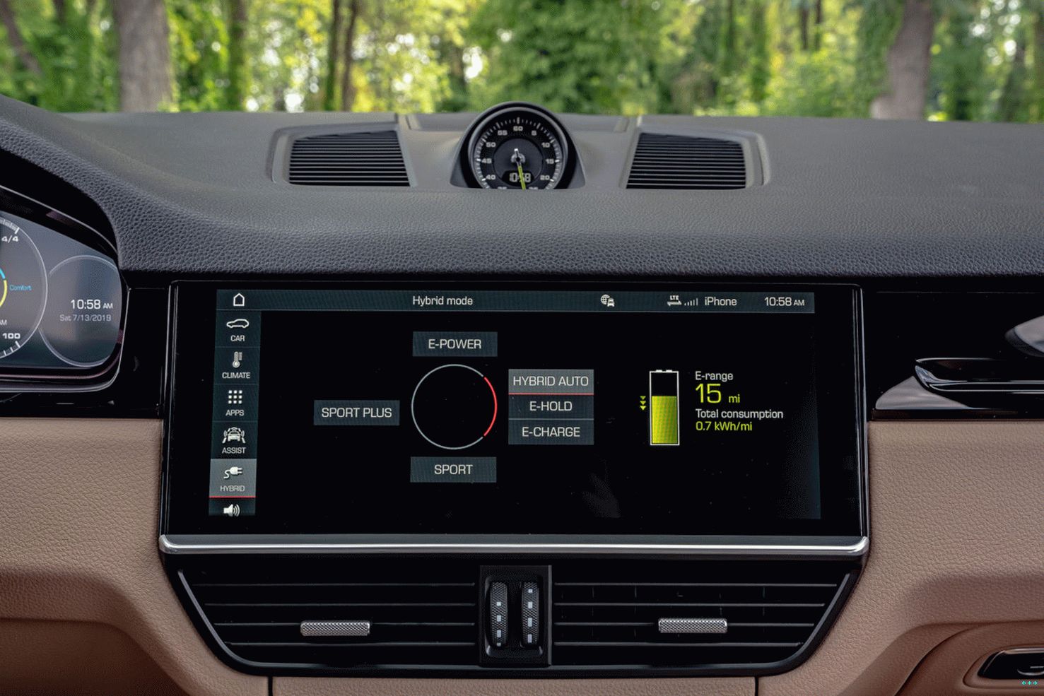 Existuje několik dalších hybridních režimů. Hybridní Auto inteligentně vypočítá ideální kombinaci elektrické a plynové energie vzhledem k aktuálním jízdním podmínkám. Pokud používáte vestavěné Cayenne GPS, bude auto brát v úvahu cíl a vzdálenost. (Pokud nedůvěřujete vestavěným satnavovým systémům, je CarPlay standardem Cayenne; Android Auto není podporován.) Režim E-Hold se uloží Baterie pro pozdější, udržet Cayenne běžící na plynu v prozatímní. V režimu E-Charge se motor plně a aktivně nabíjí baterie. Přepínání mezi hybridními režimy vyžaduje výlet do 12,3palcový displej, ale pohybující se mezi E-Power, Hybrid Auto, Sport, a Sport Plus lze provést pomocí otočného přepínače na volant.